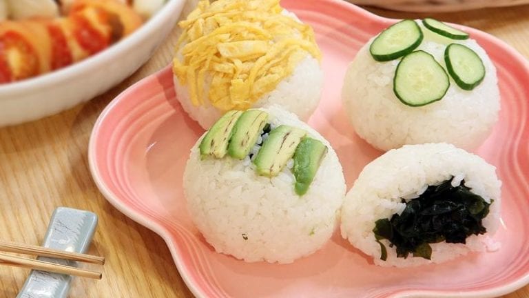 双手沾湿取适量白米饭,塞入适量海带芽捏成球状;准备一张保鲜膜,小黄瓜铺底、饭团盖上后,利用保鲜膜包覆使饭团形状更圆。酪梨、蛋皮皆铺底盖上饭团即可。