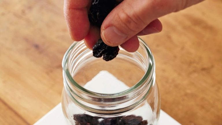 煮沸消毒过的瓶子完全晾乾,降至人体肌肤温度左右时,一边将葡萄干放入煮沸消毒过的瓶子中,一边秤重。