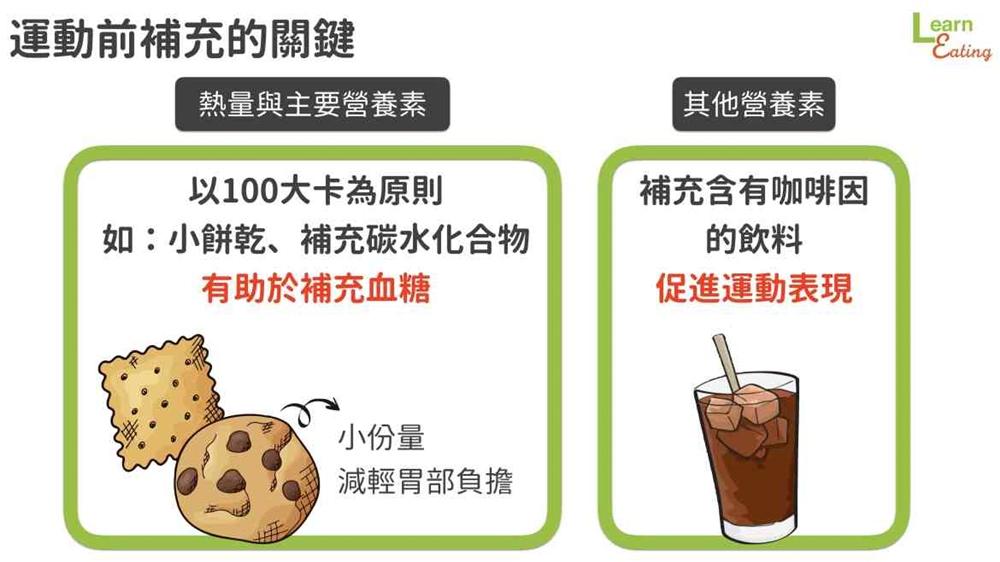 所以,重点会是在你的运动强度!如果运动的强度大于心率130-140,总运动时间超过一小时,消耗的卡路里约在200-300大卡以上,才真的需要运动补充! 运动前该吃吗?又该吃些什么? 一般而言,运动前会需要吃一点点碳水化合物的食物,像是小饼干类的,整体热量不要超过100大卡,这些饼干不会占据太多的胃部空间,避免剧烈运动造成的胃部不适感,而且小饼干类会慢慢的释放碳水化合物进入血液中,补充运动时所需要的血糖。 营养师也建议在运动期间,除了需要持续少量的补充水分以外,也可以考虑喝无糖黑咖啡!黑咖啡中有咖啡因可以促进运动表现,让你可以运动的更久!