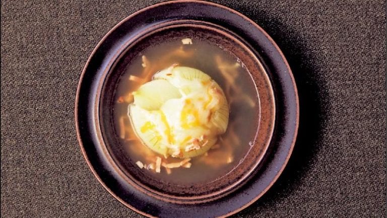 用竹签戳洋葱,煮到竹签能直接穿透洋葱后就盛入碗中,摆上起司再倒汤。