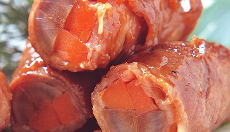 精选影音 牛肉八幡卷 【材 料】 牛蒡 1支 红萝卜 1条 牛肉薄片 200公克 太白粉 适量 煮汁: 鲜美露 50㏄ 水 150㏄ 酱汁: 砂糖 6公克 米酒 30㏄ 鲜美露 30㏄ 【做 法】 1.先以刀背刮除牛蒡表皮,先切成10公分长短后,再纵切成四等份。 2.红萝卜洗净去皮后,先切成10公分长短后,再纵切成四等份。 3.煮汁和作法1的牛蒡煮至滚沸后,改以小火煮约5分钟后,再放入作法2的红萝卜同煮约5分钟至食材稍微变软。 4.将牛肉薄片摊平,涂抹上一层薄薄的太白粉,放入作法3的牛蒡和红萝卜后卷起。 5.取平底锅倒入适量油烧热后,放入作法4的牛肉卷煎至上色后,将混合搅拌均匀的酱汁倒入,以小火煮至酱汁略收起锅盛盘即可。