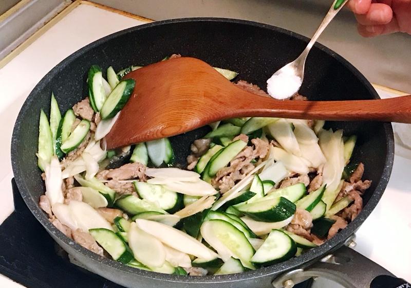 同锅放入黄瓜片,炒至油亮微软后,放入猪肉拌炒在一起,再放入姜片炒香。