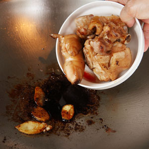 猪脚淋上酱油、米酒,静置醃10分钟。