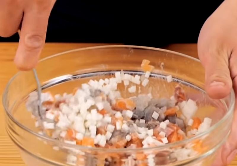 虾泥跟鲑鱼搅拌均匀后,再放入山药丁拌匀。