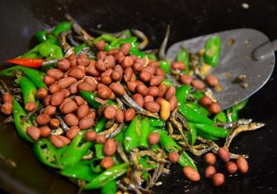 丁香小鱼干变色后,下蒜末爆香,接着放入青龙辣椒跟红辣椒翻炒,并以2~3小匙盐跟适量米酒调味。