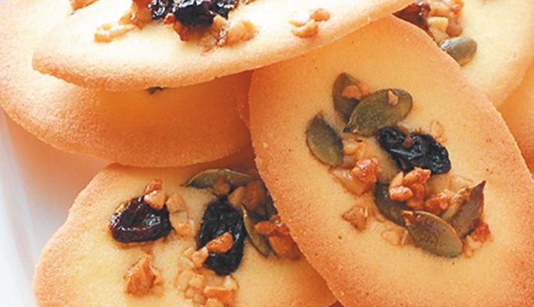 精选影音 莉斯饼干 【材 料】 奶油 100公克 糖粉 80公克 全蛋 75公克 低筋面粉 100公克 兰姆酒 3公克 葡萄干 20公克 蜂蜜 20公克 核桃 20公克 杏仁角 20公克 【做 法】 1.将软化的奶油、过筛的糖粉一起放入容器内,用打蛋器打至松发。 2.将全蛋打散成蛋液后,分2~3次慢慢的加入于作法1中拌匀后,再加入兰姆酒拌匀,即为面糊,再装入挤花袋中。 3.烤盘舖上烤盘布后,挤出适量的面糊在烤盘上成椭圆形状备用。 4.葡萄干、蜂蜜、核桃、杏仁角一起混合拌匀后,放在作法3的面糊上面,以上火180℃、下火150℃烤约15分钟即可。 【备 注】 烘焙火力:上火180℃、下火150℃ 烘焙时间:15分钟 数量:30片(每个约10公克)