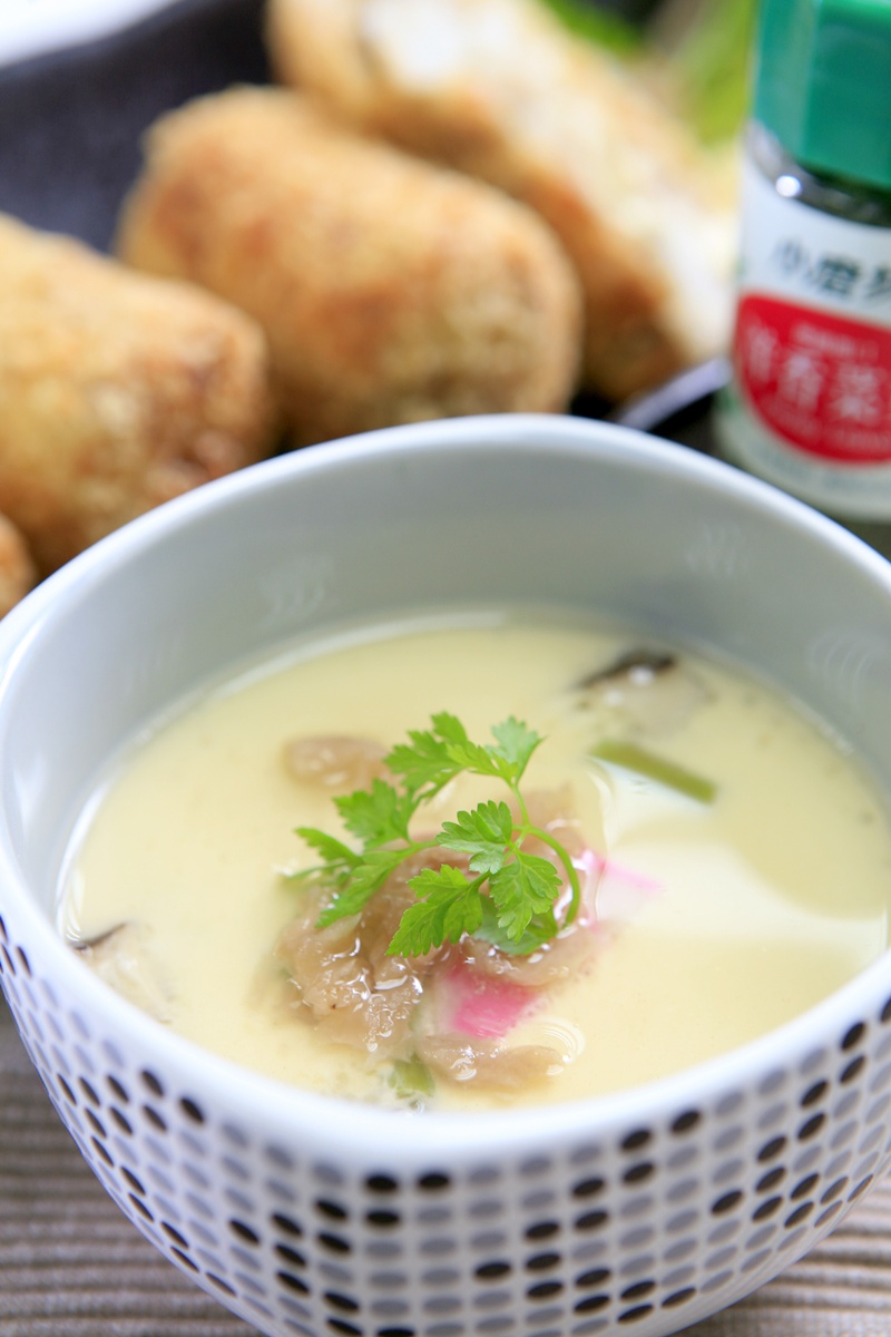 水5大匙加入柴鱼粉1大匙、酱油,与太白粉勾芡,淋在蒸好的茶碗蒸上即完成。