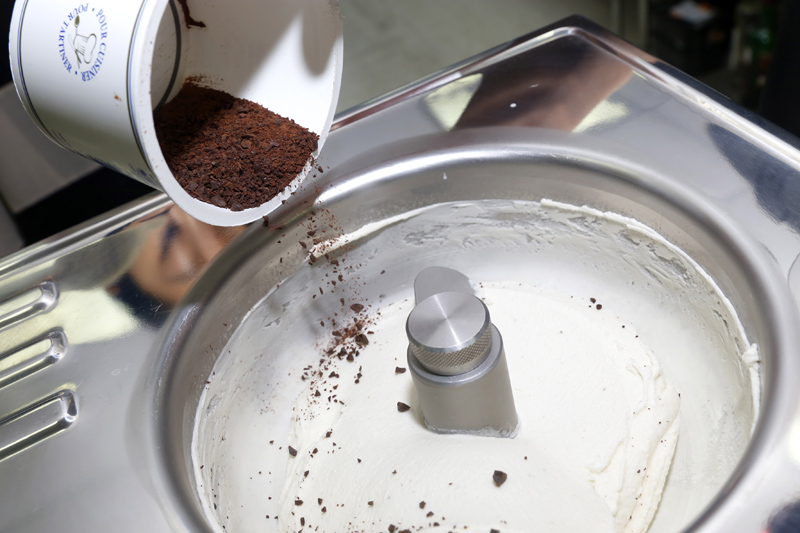 最后,加入巧克力碎,均匀搅拌,放入冷冻库1小时后,以冰淇淋勺挖出盛盘即可。