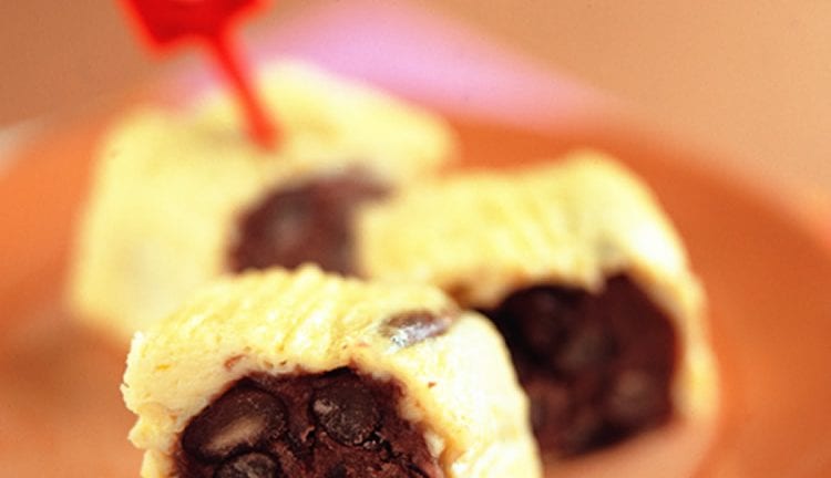 - 3.锅底再抹油,倒入适量作法1的蛋液,并掀起锅边蛋皮,让新加入的蛋液流入下方确实布满整个锅底,煎至半熟时,将后端的蛋皮折往已卷盖红豆泥的一端,再折向前方锅边,重复上述步骤直到蛋液用完。