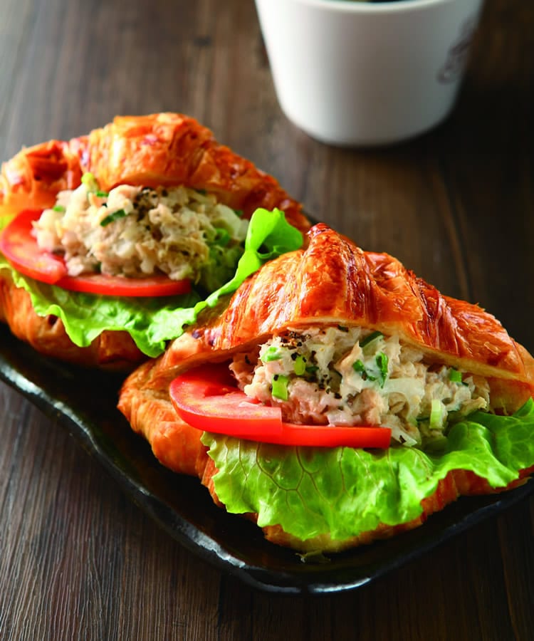 精选影音 鲔鱼可颂三明治 【材 料】 鲔鱼罐头 1罐 可颂面包 2颗 大陆A 2片 大番茄 1/2颗 洋葱 1/3颗 青葱 1根 【调 味 料】 美奶滋 2大匙 柠檬汁 少许 香油 1小匙 盐 少许 黑胡椒 少许 【做 法】 1.将鲔鱼取出沥干水分;洋葱切碎;青葱切葱花;大番茄切片,备用。 2.可颂面包以面包刀斜切不要断,备用。 3.将作法1的鲔鱼肉、洋葱岁、葱花和所有调味料混合搅拌均匀成内馅。 4.作法2切好的可颂面包先夹入大陆A,再加入番茄片,最后夹入作法3的内馅即可。