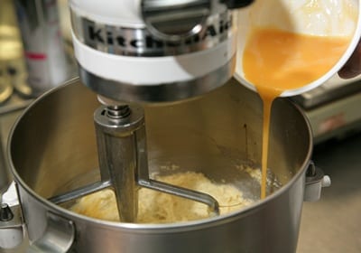 倒入蛋液时,为了要使其完全与奶油充分打匀,建议最好是分多次、少量地加入。