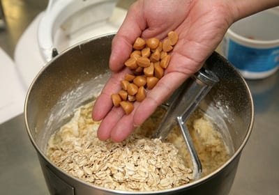 再放入大燕麦片和切成小丁状的牛奶糖。