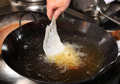 建议用深一点的油锅,鱼一下锅就把火关掉,此时油锅会从摄氏160度降至120度,慢慢用余温将鱼炸熟。