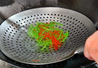 把红椒丝、青椒丝一起烫过,起锅。