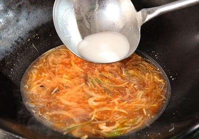 取约1汤匙太白粉,加1碗水混合后,下锅勾芡即完成五柳酱。