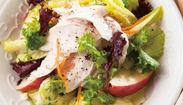 精选影音 鸡肉苹果优格沙拉 【材 料】 鸡胸肉 100公克 综合生菜 100公克 红萝卜 20公克 苹果块 1/4颗 粗黑胡椒粒 1公克 橄榄油 1大匙 【调 味 料】 原味优格 300公克 盐 1/4小匙 【做 法】 1.鸡胸肉洗净,放入滚水锅以中小火汆烫至熟,取出静置冷却,拆粗条状,备用。 2.综合生菜洗净,沥干水分,加入橄榄油轻轻拌匀;苹果去籽、切片;红萝卜洗净、去皮后切丝;调味料拌匀成酱料,备用。 3.将作法1~2所有食材盛盘,淋上酱料,撒上粗黑胡椒粒即可。 【备 注】 鸡胸肉是很健康营养的部位,因为它的油脂含量很低,但也因为这样,肉质比较容易柴涩,所以汆烫时间不能过久,只要筷子可轻插过鸡胸肉最厚的地方,就可以把它捞起。