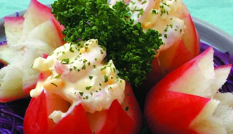 精选影音 蟹肉莲雾盅 【材 料】 莲雾 2粒 蟹肉 60公克 白煮蛋 1颗 洋葱丁 20公克 紫高丽菜丝 10公克 【调 味 料】 美乃滋 120公克 盐 适量 白胡椒粉 适量 【做 法】 1.莲雾洗净,于顶部三分之ㄧ处横向切开,再挖除中间部分成ㄧ盅状备用。 2.热一汤锅煮水至滚沸,放入蟹肉汆烫后取出,泡冰水冷却、捞起备用。 3.白煮蛋去壳切粗丁备用。 4.调理盆,放入洋葱丁、作法2的蟹肉、适量盐、白胡椒粉及美乃滋一起混合拌匀备用。 5.将作法4的食材与作法3蛋丁填入作法1的莲雾盅内,最后撒上紫高丽菜丝盛盘即可。