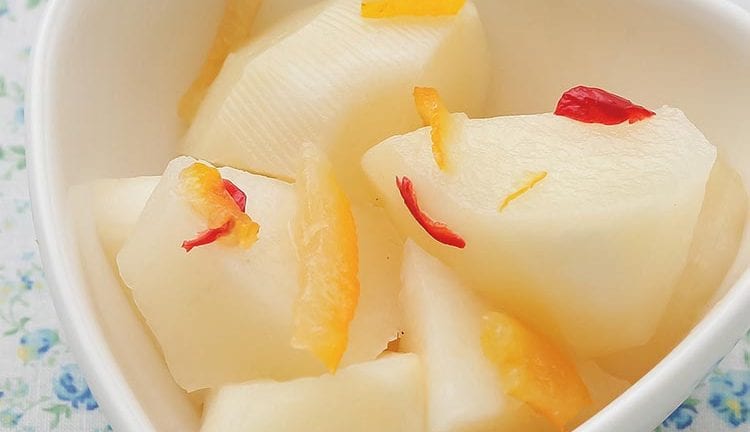 精选影音 柚香白萝卜 【材 料】 白萝卜 500公克 【调 味 料】 A.米醋 3大匙 糖 3大匙 盐 2又1/2小匙 B.柚子果酱 30公克 辣椒丝 少许 【做 法】 1.白萝卜去皮切小块,放入容器中。 2.调味料A混合后加入柚子果酱拌匀,倒入作法1中。 3.再加入辣椒丝拌匀,稍醃约半天即可。