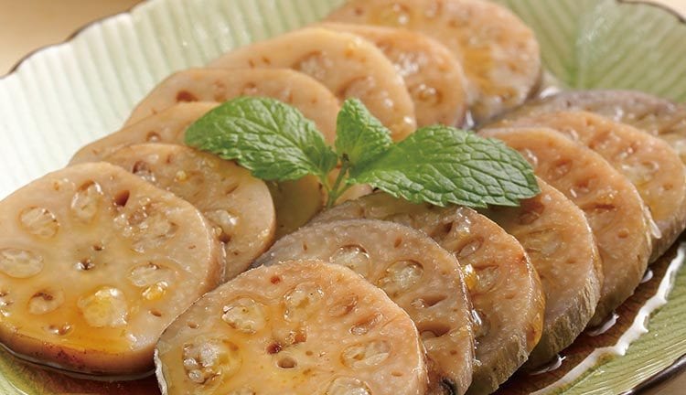 精选影音 蜜汁糖莲藕 【材 料】 整段莲藕 2条 圆糯米 80公克 【调 味 料】 白糖 500公克 水 1000㏄ 蜂蜜 2大匙 【做 法】 1.糯米洗净后泡水30分钟后沥干;莲藕洗净后从顶端约2公分处切开,盖子留下。 2.将糯米填入莲藕的孔缝中,一面填一面轻敲莲藕使米粒均匀,填至九分满,盖上盖子,用牙签将盖子插紧以防脱落。 3.莲藕放入锅中,加入白糖及水,盖上锅盖以大火煮滚。 4.煮滚后关小火煮约1个小时关火,焖约20分钟,打开锅盖莲藕取出,取下牙签,切成厚约1公分的薄片装盘,淋上蜂蜜即可食用。