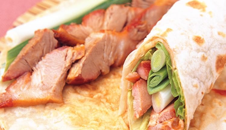 - 5.将荷叶饼摊开,抹上叉烧汁,排入叉烧肉、青葱、香菜,卷成长筒状即可。