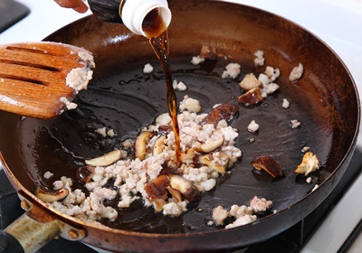 热锅,放入1匙沙拉油,加入香菇丝爆香,续加入绞肉拌炒至香味飘出,倒入酱油、盐等调味。