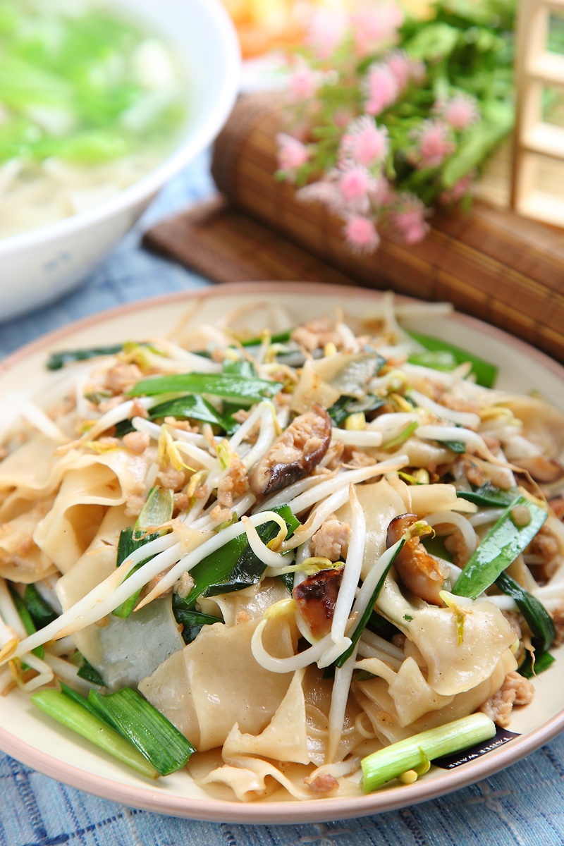 泡冷水的面条捞起、略微沥干水,加入锅中拌炒,续加入韭菜、豆芽菜拌炒至入味即可起锅。