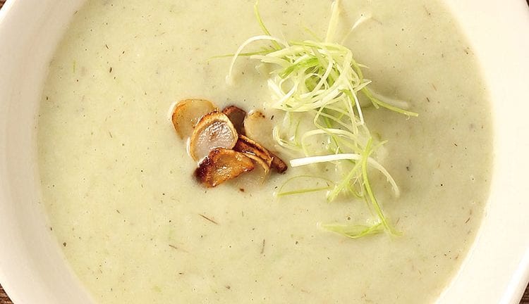 精选影音 蒜味马铃薯浓汤 【材 料】 蒜苗段 20公克 蒜仁 5颗 西芹块 20公克 马铃薯块 100公克 洋葱块 20公克 橄榄油 1大匙 【调 味 料】 鸡粉 1/4小匙 鸡高汤 400cc 动物性鲜奶油 10cc 【做 法】 1.锅内放入橄榄油,炒香蒜苗段、蒜仁、洋葱块、西芹块。 2.加入马铃薯块、鸡高汤、以小火熬煮约20分钟后放置冷却。 3.再以果汁机打匀倒回锅中,加入鸡粉、动物性鲜奶油调味即可。