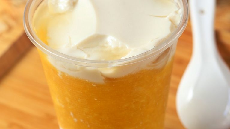 食用时先在杯中放一层豆花,接续放入果泥,再续放一层豆花。