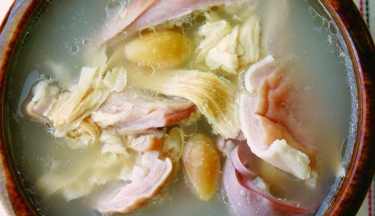 精选影音 胡椒猪肚汤(1) 【材 料】 猪肚 1个 白果 1大匙 腐竹 1根 老姜片 10片 葱白 4根 水 800㏄ 【调 味 料】 盐 1/2茶匙 鸡粉 1/2茶匙 米酒 1大匙 【做 法】 1.猪肚剪去油脂、翻面,加1大匙盐(材料外)搓洗净,再加1大匙白醋(材料外)搓洗冲净,放入滚水中汆烫3分钟后,捞出刮去白膜,备用。 2.干白果泡水约8小时后沥干;腐竹泡软,备用。 3.胡椒粒放砧板上,用刀面压破;姜片、葱白用牙签串起,备用。 4.取一内锅,放入作法1、2、3的材料,再加入800㏄水及所有调味料。 5.将作法4的内锅放入电锅里,外锅加入2杯水,盖上锅盖、按下开关,煮至开关跳起后,捞除姜片、葱白,取出猪肚用剪刀剪小块后放回汤中即可。
