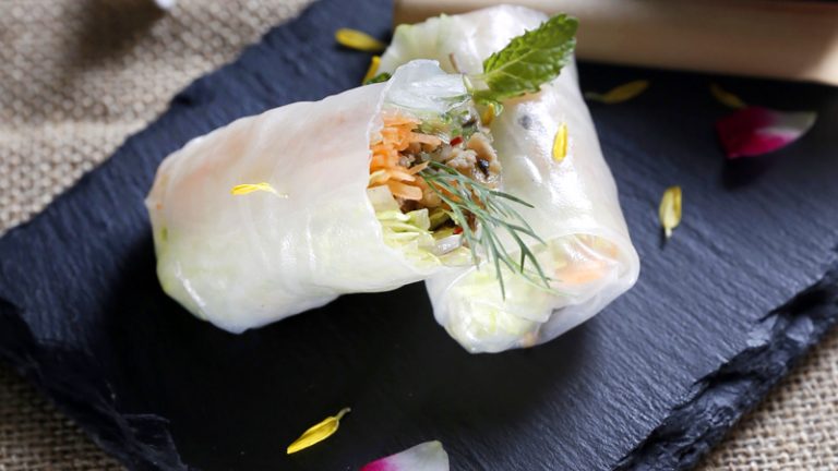 将春卷皮整片沾一下热水软化,以3种蔬菜丝铺底,再放上适量薄荷叶与米粉,最后放上梅干肉,将春卷皮左右两边略向内折后卷起,食用时沾泰式甜鸡酱即可。