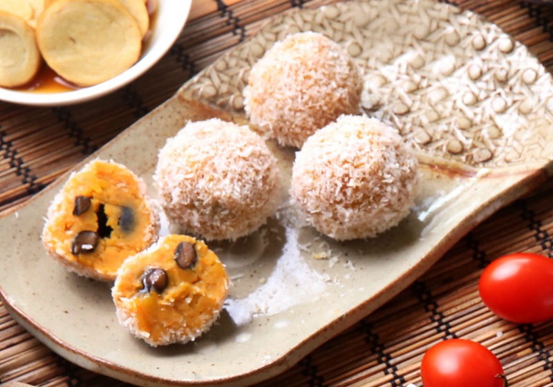 将包有黑豆的地瓜球放在椰子粉上,使地瓜球表面均匀沾上椰子粉即完成。