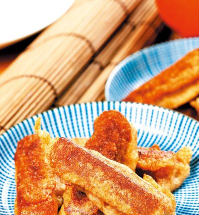 PLUS 包春卷皮 将年糕切成适量大小,再以春卷皮或馄饨皮包好,直接油炸至外皮呈金黄色即可。