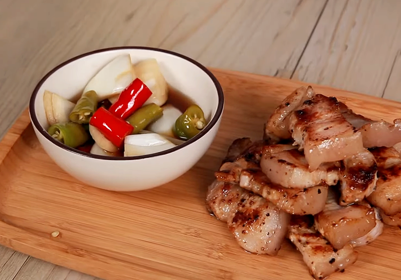 空心菜洗净切段。取出适量醃渍好的【韩式酱洋葱】及辣椒,切成适当大小。