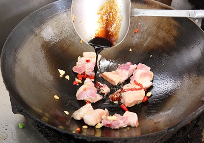 重新热锅,加入1匙油,放入1匙蒜末、1匙辣椒末爆香,加入肉片拌炒数下,续加入酱油、米酒、二砂拌炒至香气飘出,起锅备用。