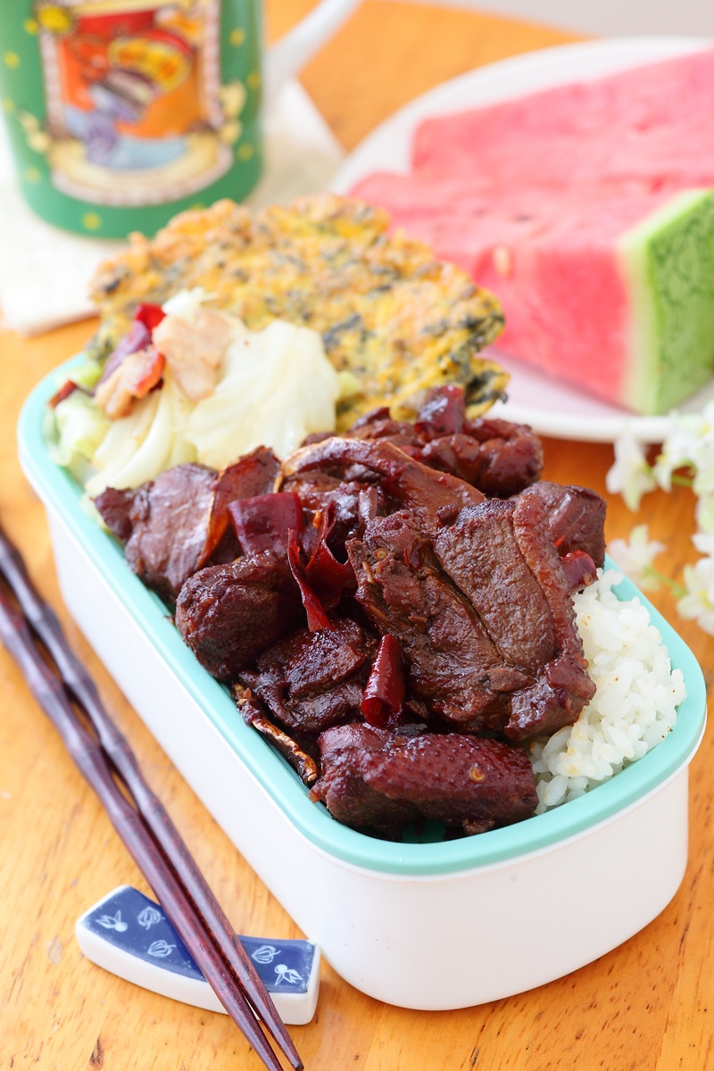 少许油热锅,姜片入油锅以中火炒香30秒,之后放入干辣椒、鸭肉,以中火翻炒至鸭肉变色。