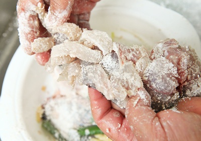 油炸时,可用夹子夹住鱼尾巴,以利油炸定型。另可利用二次炸去,先将鱼肉取出,待油温略升高时,再将鱼肉回炸一次,具有逼油的效果。