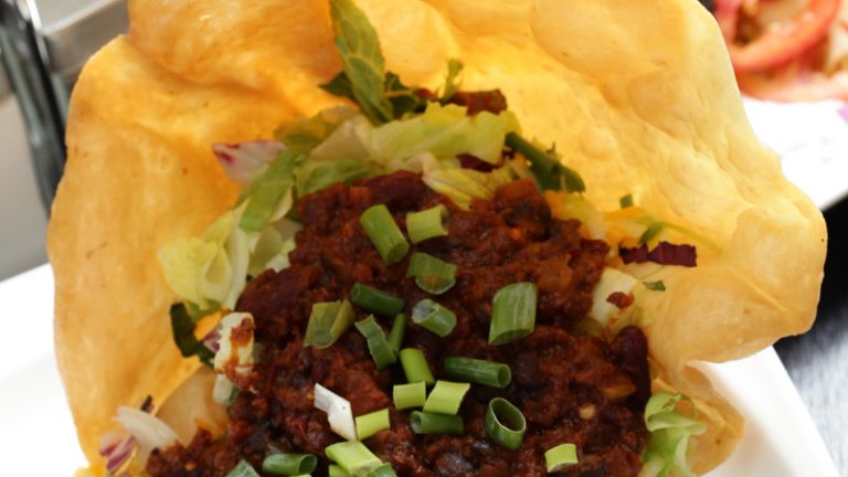 油锅加热至摄氏160度,再用油网与炸勺将墨西哥饼压炸成碗状,约3 0秒定型。
