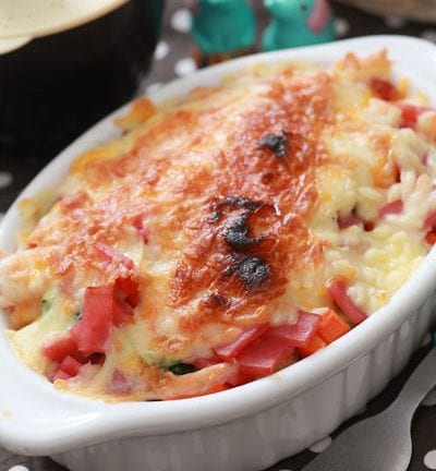 取焗烤盘,先在底层铺地瓜泥,接着再铺红萝卜丁、绿花椰菜及小玉米、火腿切片,最后撒起司丝,将焗烤盘放入烤箱,以180℃温度烤约20~25分钟即可。