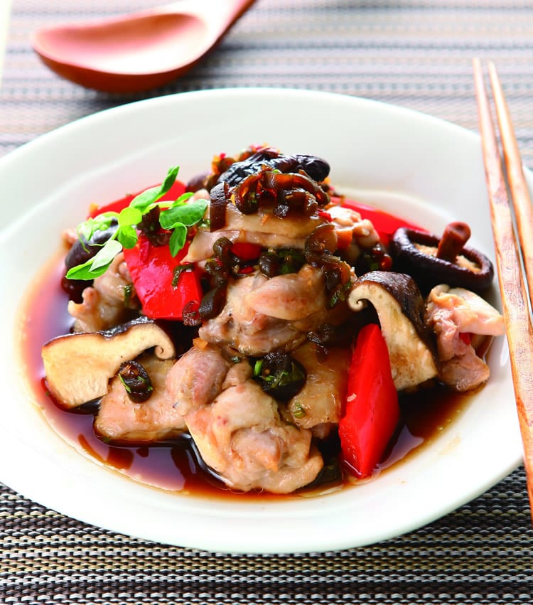 精选影音 剥皮辣酱蒸鸡 【材 料】 去骨鸡腿排 1片 干香菇 3朵 鲜香菇 3朵 红甜椒 1/3颗 【调 味 料】 剥皮辣椒酱 2大匙 【做 法】 1.将干香菇洗净,再泡冷水至香菇软化。 2.去骨鸡腿排洗净,切成大片状,备用。 3.将红甜椒切小片状;鲜香菇去蒂再切片状备用。 4.将作法1、2、3的材料都放入蒸盘中,均匀淋上剥皮红辣椒酱,放入水滚的电锅中蒸约10分钟即可。