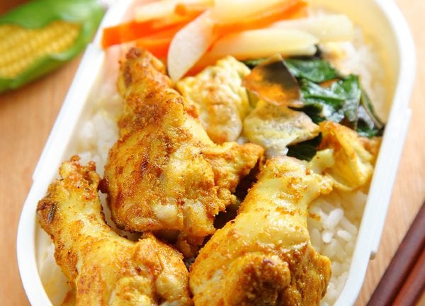 鸡小腿先均匀抹上黄咖哩粉50g及盐,放在盘中浅渍约半小时。剩下的黄咖哩粉50g加入开水200c.c.调成咖哩酱汁备用。