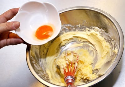 将奶油放入钢盆中,放在室温下(冬天1小时、夏天则30分钟),奶油质地变软后,再用搅拌棒将奶油搅拌均匀至呈现淡淡的黄色,再加入糖粉搅拌均匀。