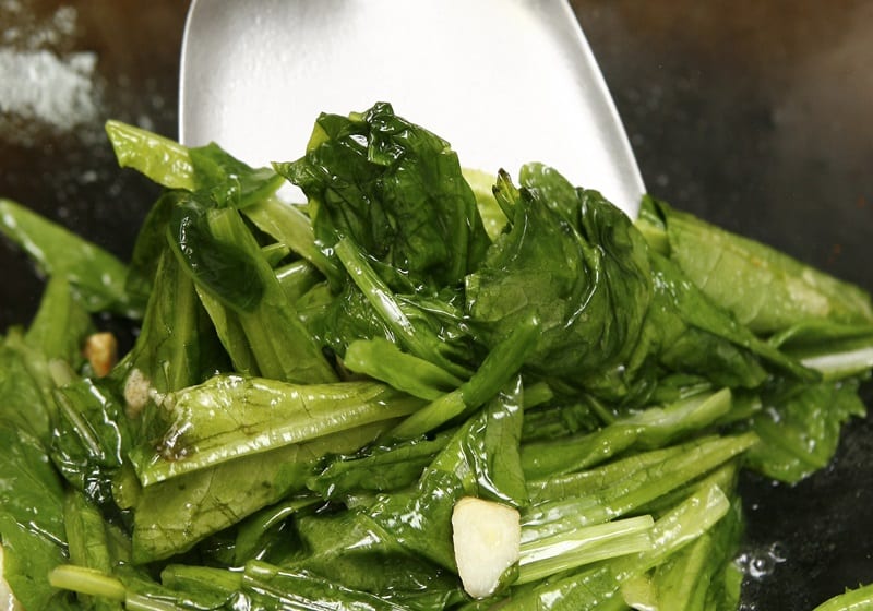 【有此一说】加点小苏打会让青菜变得更翠绿? 青菜中含有叶绿素,在料理加热过程中会造成叶绿素(chlorophyll)中「镁离子」流失,导致蔬菜颜色变暗。但在加入小苏打之后,变成碱性环境,让叶绿素转变成叶绿酸(chlorophyllin),使颜色变得鲜绿。 营养师提醒大家,炒菜加小苏打会损失更多维生素,非必要建议不加比较好。 青菜热炒不变色的秘诀 一、「叶菜类」适用快速翻动法 适用于一般的叶菜类,如:A菜、空心菜。