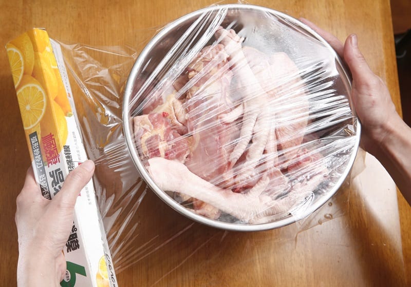 铺上鸡肉块,并盖上两层保鲜膜紧密封口。