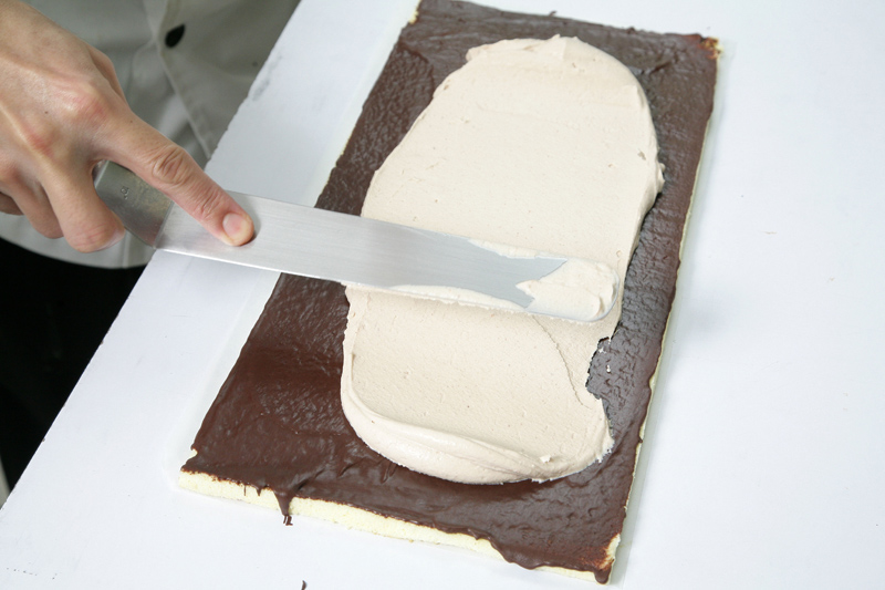取另一层蛋糕置于其上,重复步骤4及步骤5。放上最后一层蛋糕、抹巧克力馅后,用挤花袋将剩下的栗子馅挤出条纹花样,上桌前切成小块即可。