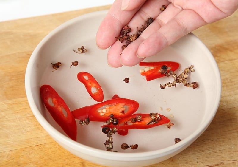 先准备凉水400c.c.,加入盐1汤匙、蒜末、米酒、花椒粒、辣椒片少许,制作出泡菜醃汁。