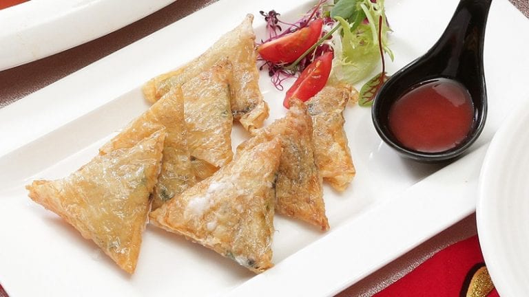 将炒好之馅料,用豆腐皮包卷成三角形状,最后在收口处涂上面糊固定后,放入油锅内,以摄氏160度热油炸至金黄色即可起锅摆盘;食用时可沾甜辣酱。