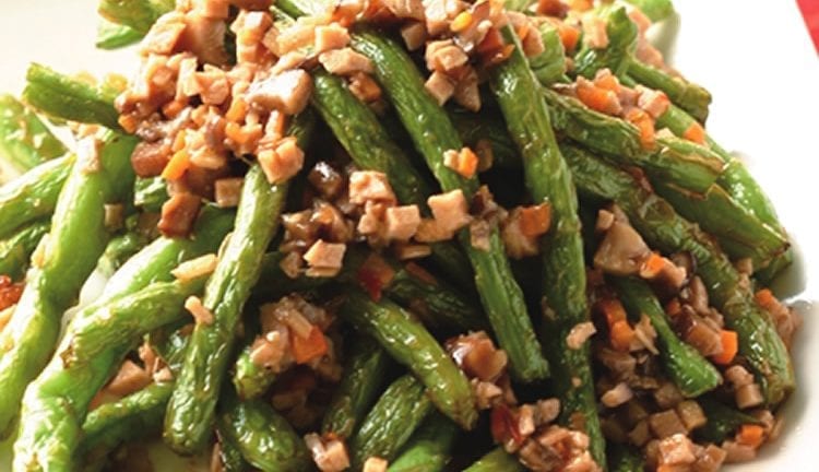 精选影音 干扁四季豆(3) 【材 料】 四季豆 600公克 姜末 20公克 冬菜末 10公克 红萝卜末 20公克 香菇末 20公克 素火腿末 10公克 【调 味 料】 辣椒酱 1大匙 砂糖 1小匙 胡椒粉 1小匙 香油 1大匙 【做 法】 1.四季豆洗净去头尾,放入150℃的油锅中,炸至干扁,捞起沥油备用。 2.取锅,加入少许油,放入其余的材料炒香后,加入调味料拌匀,再放入作法1的四季豆略拌炒即可。