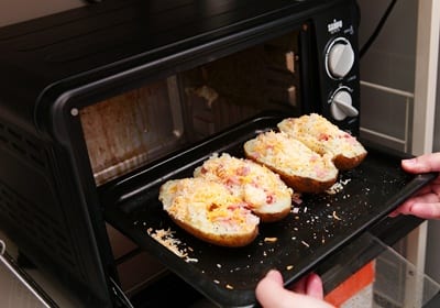 马铃薯放上烤盘,入烤箱以摄氏200度烤8∼10分钟,马铃薯表面的综合起士丝、奶油等均融化即可。