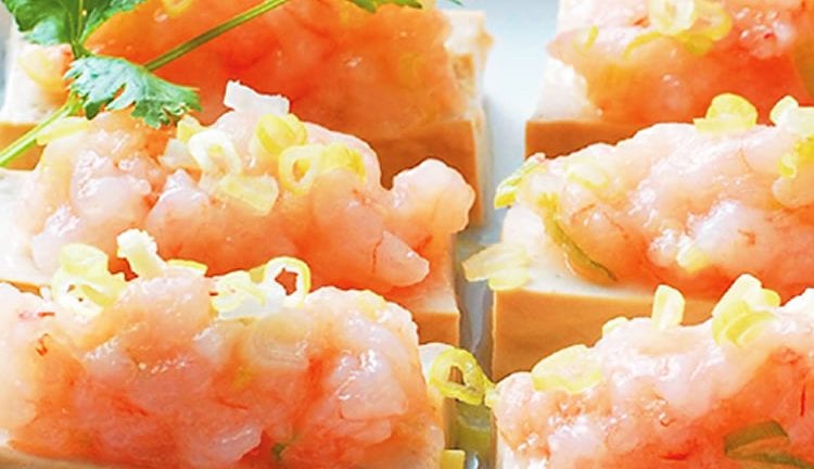 精选影音 豆腐虾仁 【材 料】 虾仁 150公克 豆腐 1块 葱花 20公克 姜末 10公克 【调 味 料】 A.盐 1/4茶匙 鸡精粉 1/4茶匙 细糖 1/4茶匙 B.太白粉 1大匙 香油 1大匙 【做 法】 1.虾仁挑去肠泥、洗净、沥干水分,用刀背拍成泥,加入葱花、姜末及调味料A搅拌均匀,再加入太白粉及香油,拌匀后成虾浆,冷藏备用。 2.豆腐切成厚约1公分的长方块10块,平舖于盘上,表面撒上一层薄薄的太白粉。 3.将作法1的虾浆平均置于豆腐上,均匀的抹成小丘状,重复至材料用毕。 4.电锅外锅加入1/2杯水,放入蒸架后,将豆腐整盘放置架上盖上锅盖,按下开关蒸至开关跳起即可。 【备 注】 外锅水量:1/2杯水
