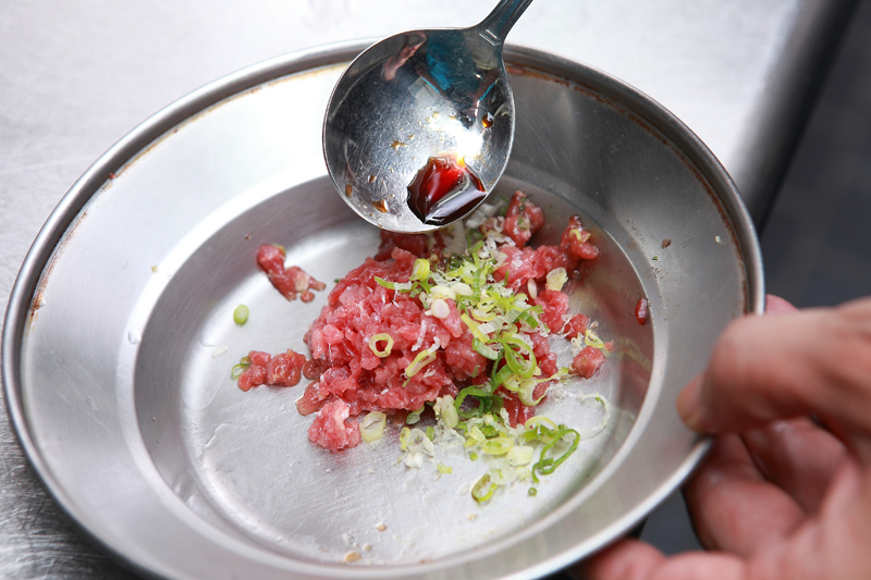 鲔鱼生鱼片切碎后与葱花、酱油于容器中拌匀,备用。山苦瓜切除内膜与内层,切约2公分块状,备用。